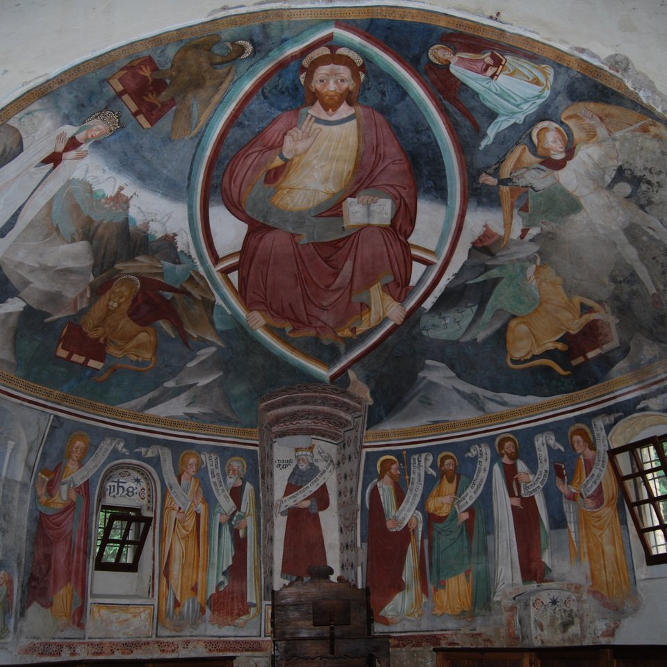 Gli affreschi tardo quattrocenteschi probabilmente opera dei Boxilio (indicati nei documenti d’archivio anche come Baxilio, o Basiglio), di Castelnuovo Scrivia, titolari della più importante bottega del tortonese. Il catino absidale è occupato dalla figura del Cristo pantocratore circondato dai simboli dei quattro Evangelisti (Tetramorfo), con la figura elegantemente abbigliata della Vergine da un lato e da quella di San Michele Arcangelo dall’altro. Nel registro inferiore, in una nicchia collocata proprio sotto la mandorla con il Cristo, è posta – a sottolineare la continuità tra Vecchio e Nuovo Testamento – la figura di Re Davide, con barba e capelli canuti, affiancata sui due lati dalla usuale teoria dei Dodici Apostoli e da un’immagine del Cristo in Pietà. Lo stile, a dispetto della data di esecuzione, è ancora marcatamente gotico.