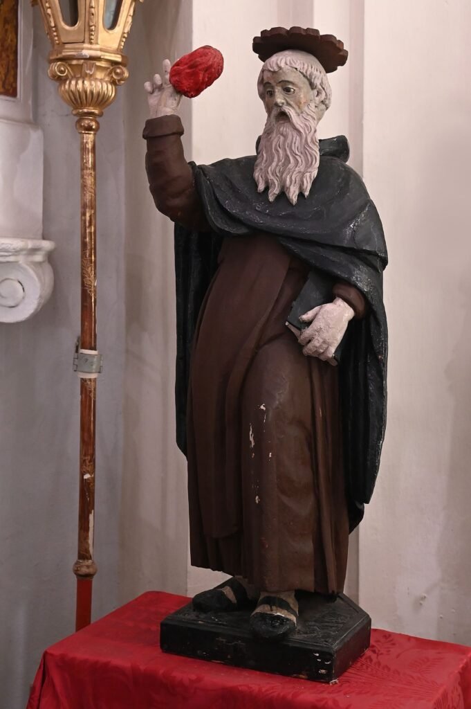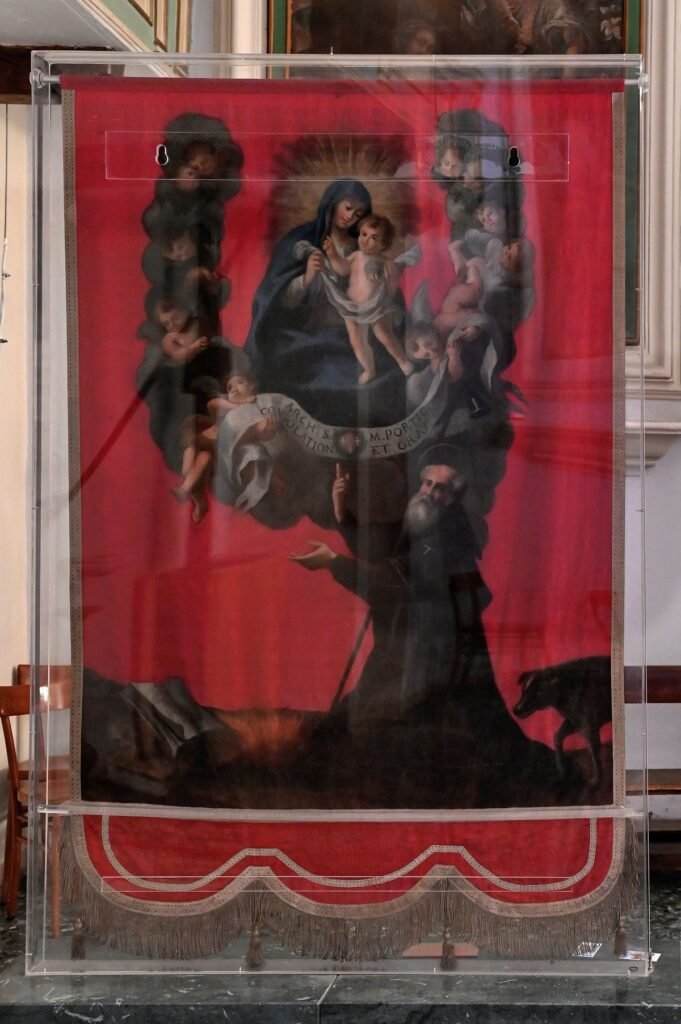 Un Gonfalone seicentesco ha la particolarità di essere dipinto da entrambe le parti con lo stesso soggetto a specchio e raffigura il Santo, nella sua classica iconografia, con il maiale e il bastone a T e in alto la Vergine col Bambino tra angeli. Il gonfalone è dipinto a olio su seta damascata.