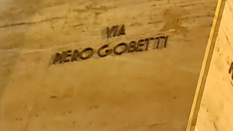 L’indicazione della “via Piero Gobetti” bisogna andarsela a cercare su in alto fra le architetture della ricostruzione mussoliniana di via Roma e non c’è nulla più di un nome ed un cognome: via Piero Gobetti. Niente date, nessuna informazione. Difficile capire che quella via è intitolata ad un ragazzo che aveva più o meno la stessa età dei tennisti delle ATP quando è morto a Parigi, per le conseguenze di un pestaggio che ne minò la salute.